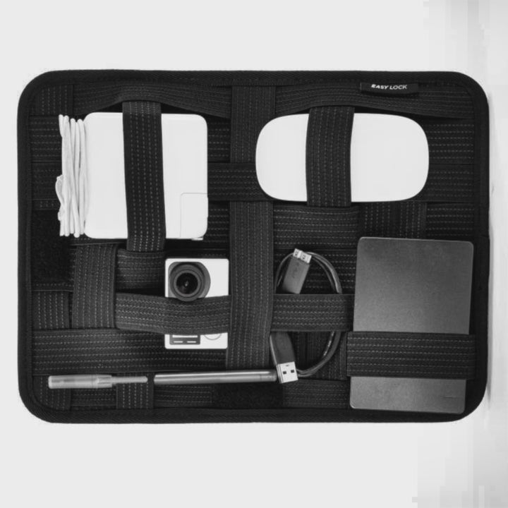 The intelligent design makes organizing easy and fun. Elastic straps grip pens, headphones, chargers, power supplies, etc. Includes back pocket with corner protector for iPad or tablet EasyLock patch with Velcro fastener to secure in your commuter