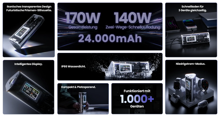Iconic style with the power bank of the future. As an all-in-one charging solution with a smart display, the power bank is ultra-fast and efficient to increase your productivity. The transparent futuristic prism shape is worth every eye-catcher. Supports 3-device fast charging. Maximum output of 170W. Maximum input power of